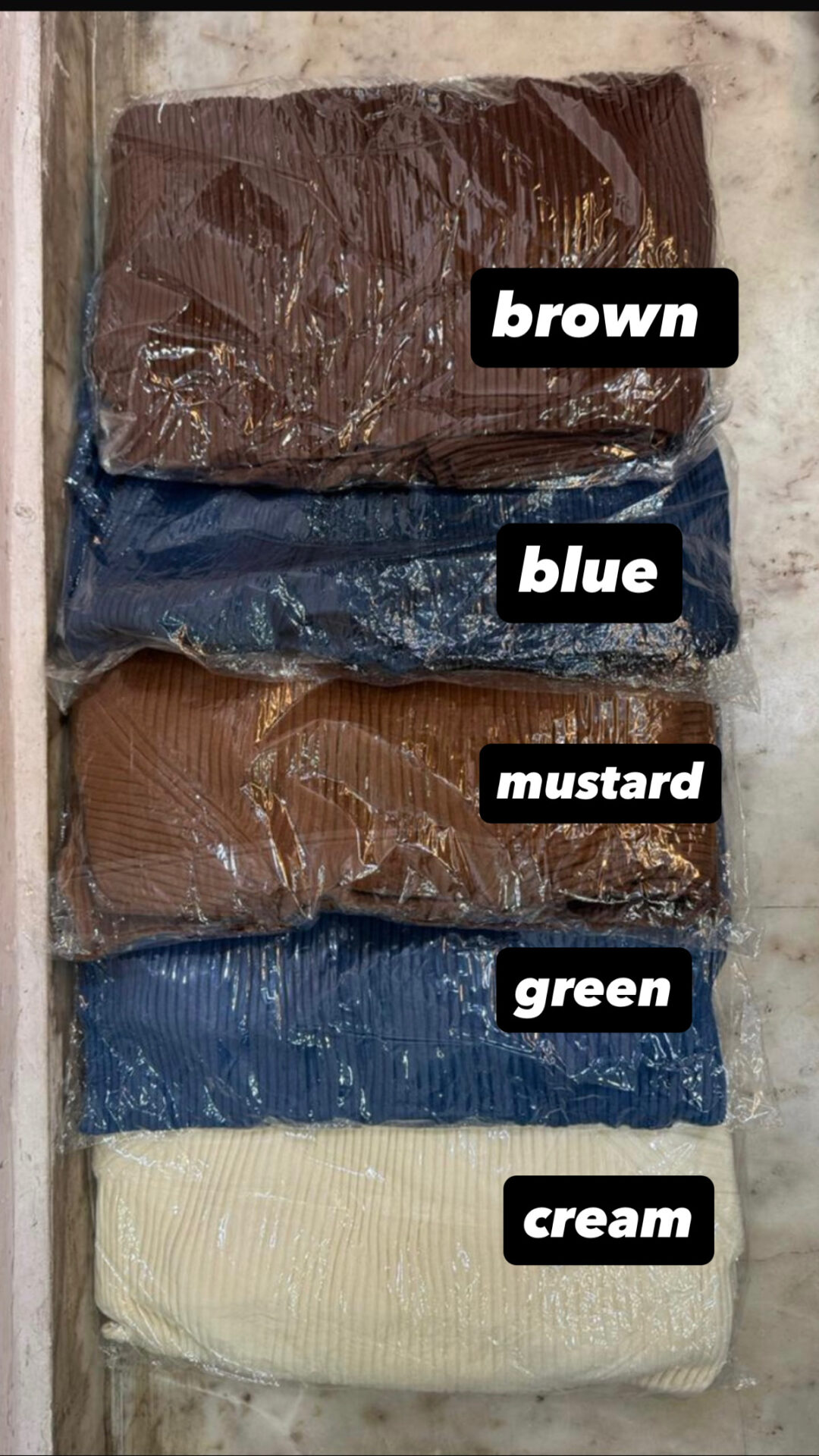 Blue, Brown, Cream, Green, Mustard